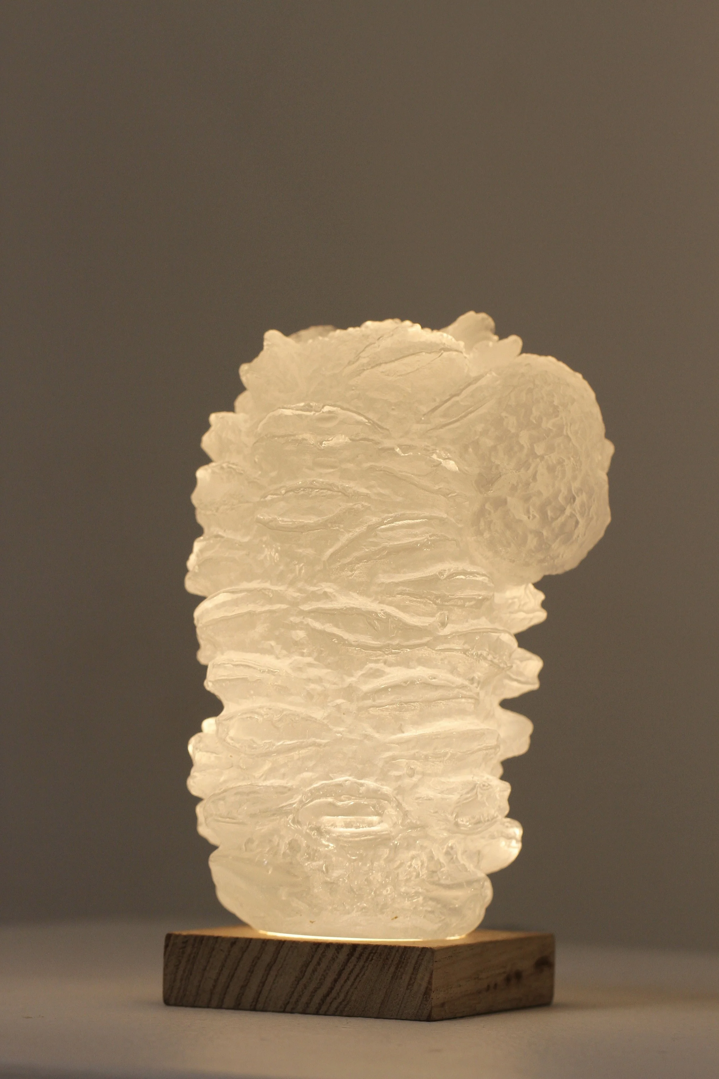 Serrata functions both as fine art and a bespoke table light. A meditation on translation, transformation and materiality, the piece features a kiln cast glass banksia and a Tassie Oak base.