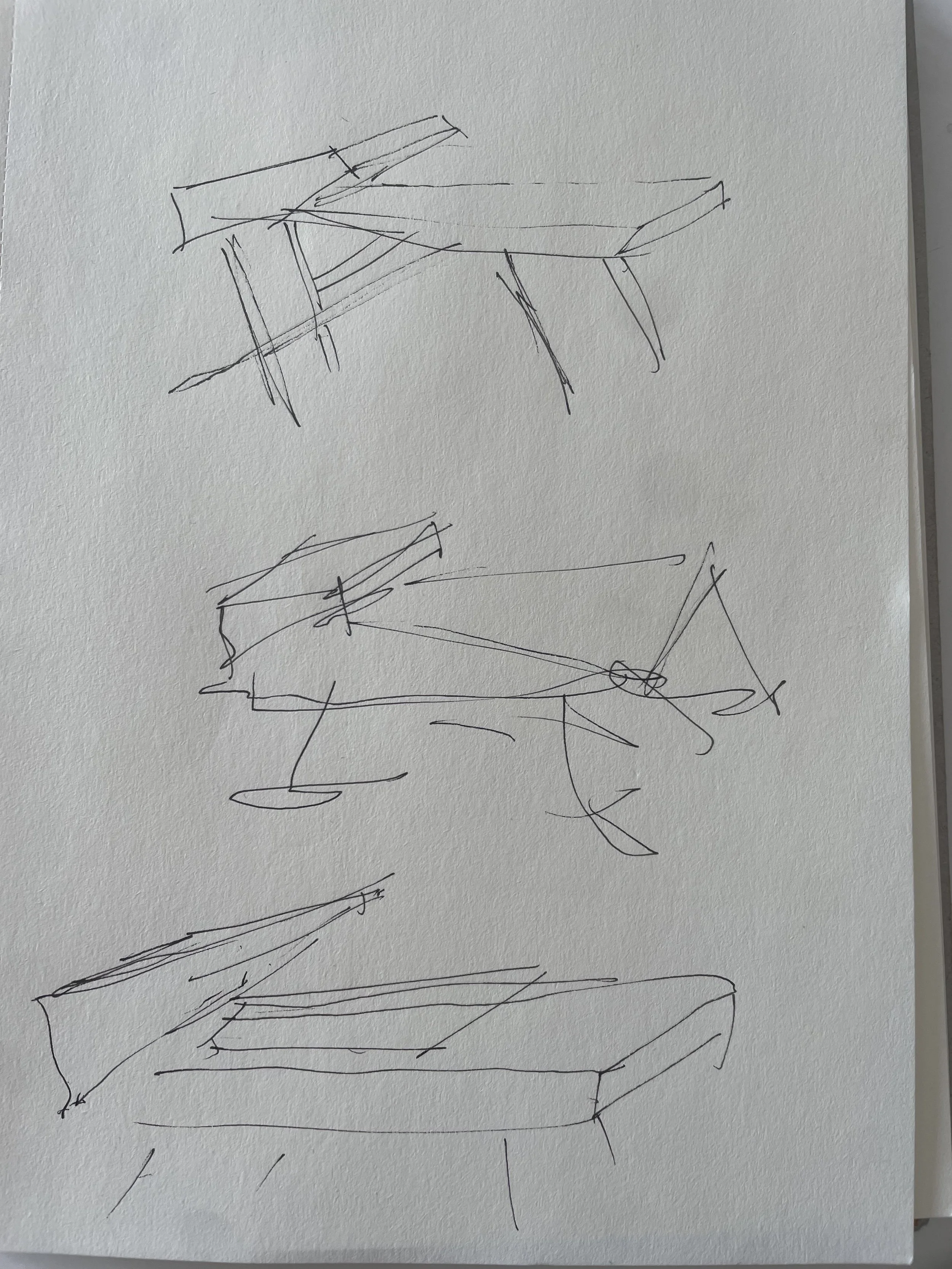Lounger Table is a coffee table that draws inspiration from both Modernist furniture and anthropomorphic forms. The design process began as over 100 sketches of different elevated surfaces. These drawings were then refined down to one final concept.